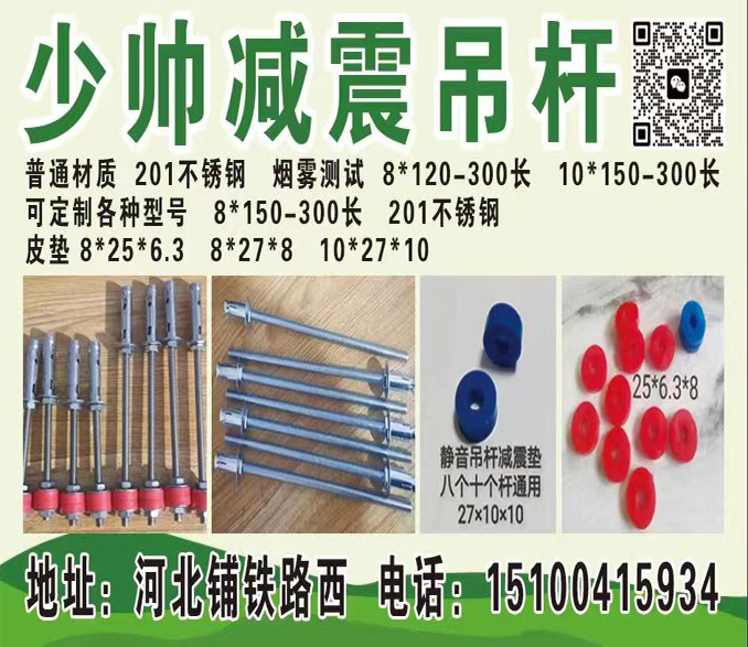 少帅减震吊杆主营:普通材质、201不锈钢静音吊杆、减震吊杆、烟雾测试8*120-300长、10*150-300长可定制各种型号 8*150-300长、201不锈钢皮垫、减震垫8*25*6.3、8*27*8、 10*27*10地址:河北铺铁路西电话:15100415934 [