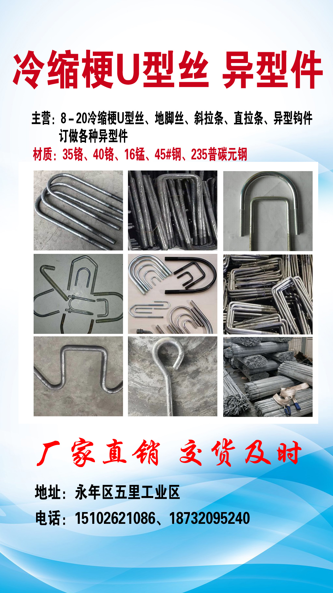 主营:8-20冷缩梗U型丝、地脚丝、斜拉条、直拉条、异型钩件、订做各种异型件