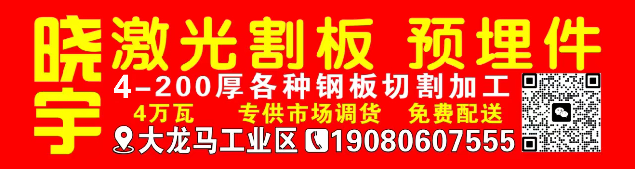 晓宇大型激光割板主要经营:4mm-200mm各种型号钢板切割;主要生产:各种钢板制品、整套预埋件、高铁预埋件、法兰盘、定位板、路灯底座、地脚板、斜铁等各种钢板制品;本厂拥有:4万瓦激光、2万瓦激光、剪板机、折弯机、和各种钢板加工设备;本厂还拥有大型螺纹钢料场、专业焊接团队、承接各种钢板整套预埋件;厂址:永年区大龙马工业区;服务电话:19080607555 (微信同步) [